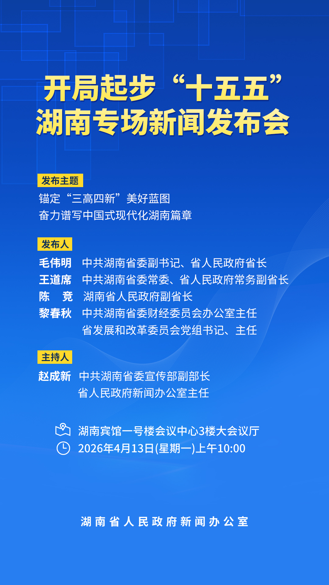 湖南省人民政府新闻办公室将于4月13日(星期一)上午10:00在湖南宾馆一号楼会议中心3楼大会议厅举行开局起步“十五五”湖南专场新闻发布会,邀请中共湖南省委副书记、省人民政府省长毛伟明,中共湖南省委常委、省人民政府常务副省长王道席,湖南省人民政府副省长陈竞,中共湖南省委财经委员会办公室主任,省发展和改革委员会党组书记、主任黎春秋围绕《湖南省国民经济和社会发展第十五个五年规划纲要》,全面介绍锚定“三高四新”美好蓝图,奋力谱写中国式现代化湖南篇章的相关情况,并答记者问。