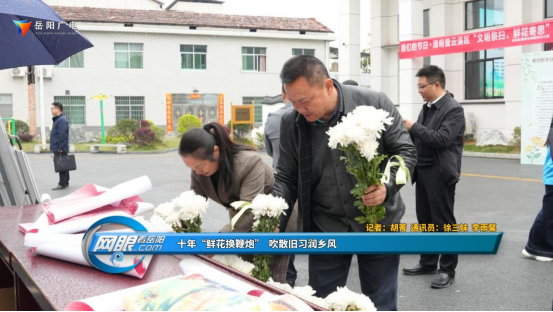 在路口镇枧冲村鲜花置换点,不少群众手拿塑料祭祀品和鞭炮,前来换取鲜花。一位村民接过鲜花,笑着对村干部丁鹏说:“不放鞭炮,清静多了。这个活动真好,还省了一笔开销。”