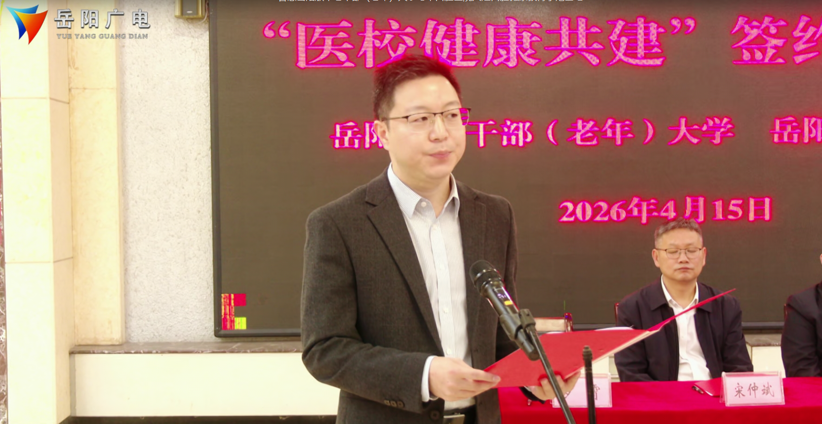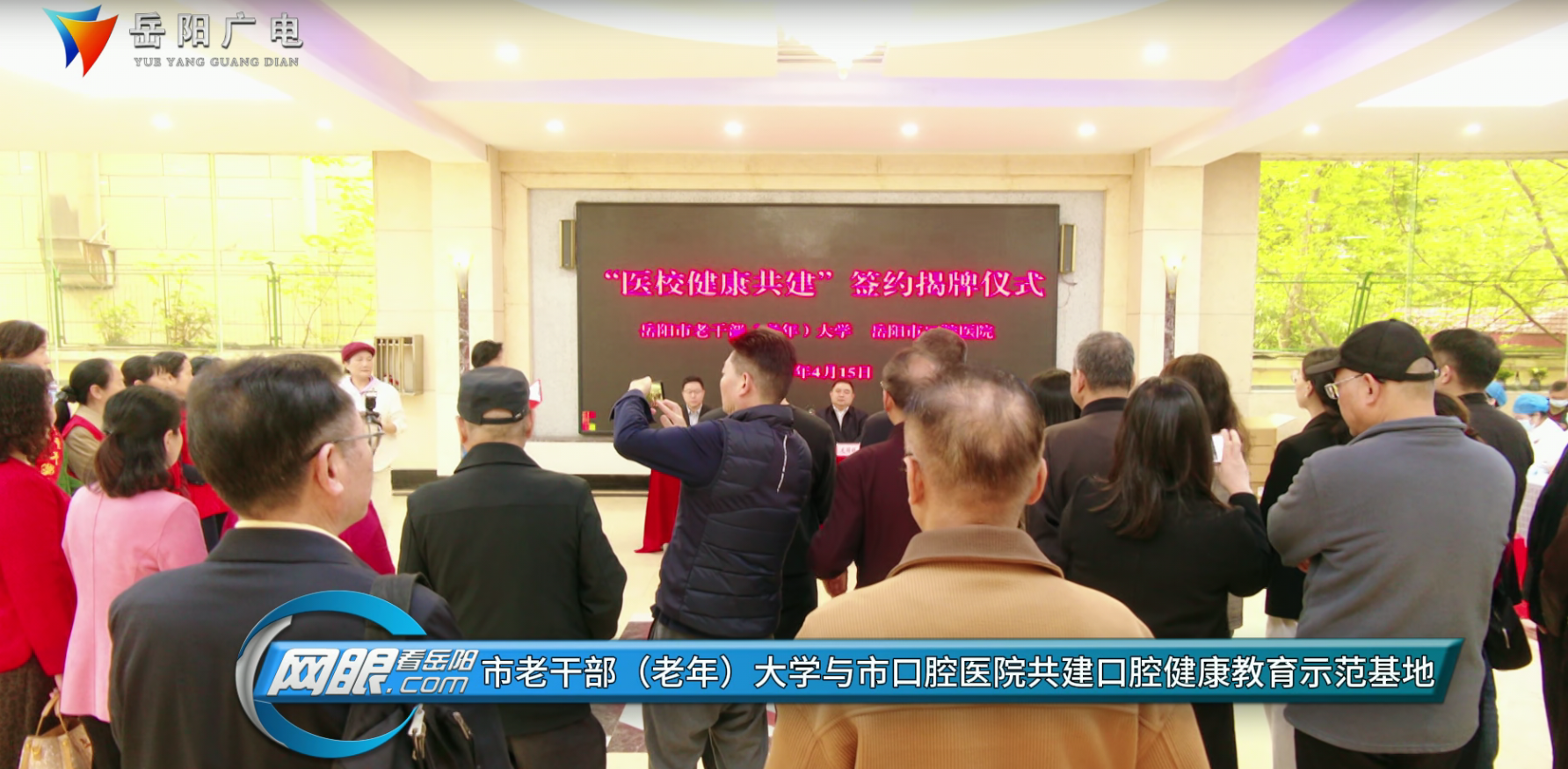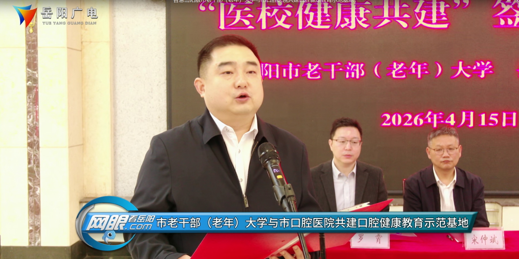 岳阳广电全媒体讯(记者:凌云志)4月15日上午,岳阳市老干部(老年)大学与市口腔医院共建口腔健康教育示范基地正式启动,市委老干部局副局长龙国旺出席签约揭牌仪式并致辞,市老干部(老年)大学校长宋仲斌,岳阳楼卫健局局长周七亿,市口腔医院院长罗霄共同为口腔健康教育示范基地揭牌。市老干部(老年)大学、岳阳楼区卫健局等相关领导及部分学员代表参加签约揭牌仪式。