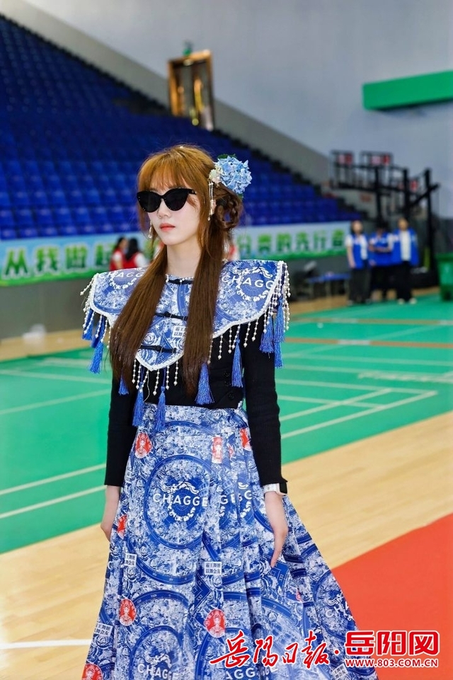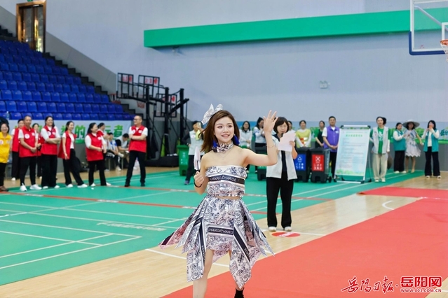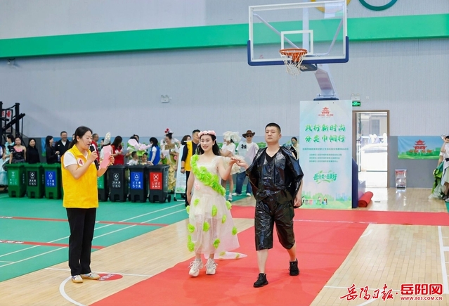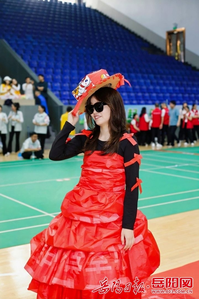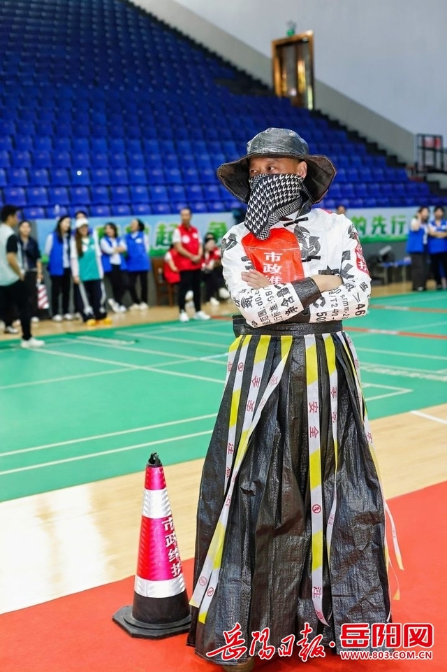 上身是奶茶袋剪裁而成的图形,让都市印记化作衣上诗行;下身是废弃窗帘布拼接之作,令旧日帷幕重组成斑斓裙摆……这些创意服装不仅融入了四色垃圾桶的颜色理念,更巧妙结合了城管系统的工作特色——每一层褶皱,都是对减少浪费的致敬;每一缕流苏,都在传递“践行新时尚 分类巾帼行”的办赛理念。在律动的广播体操之后,以“巾帼绽芳华·环保时装‘岳’秀场”为主题的展示竞赛拉开帷幕,18支队伍为现场带来了一场别开生面的视觉盛宴。
