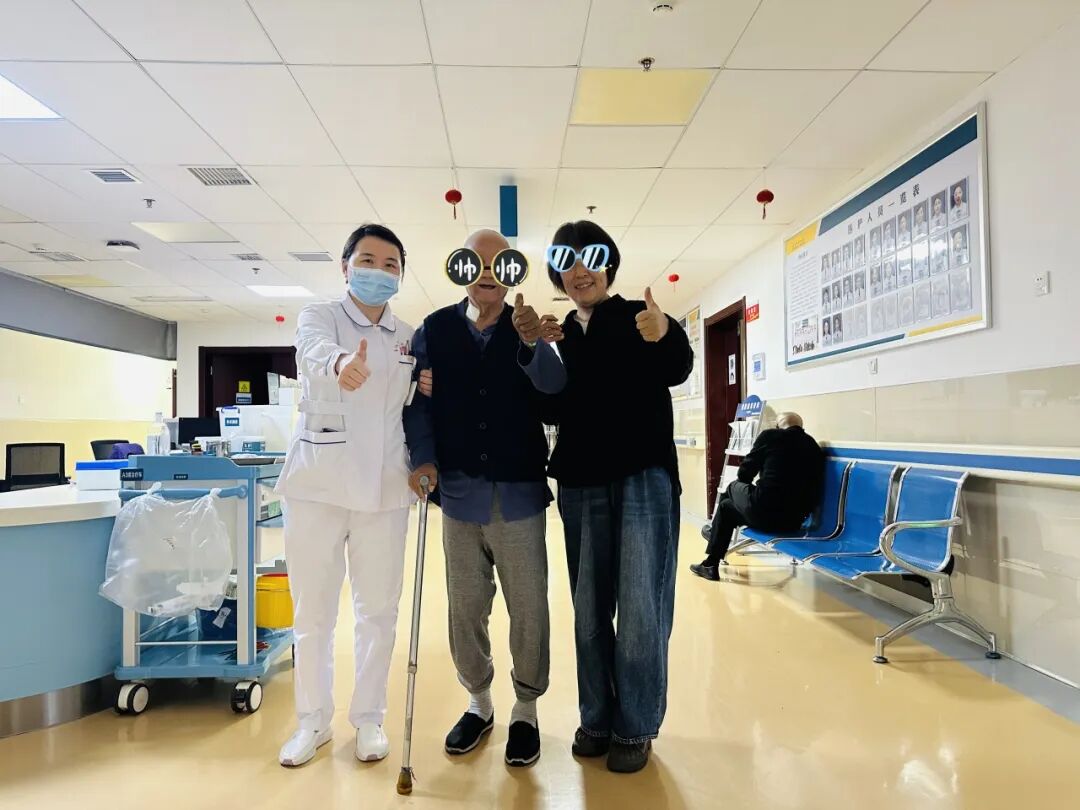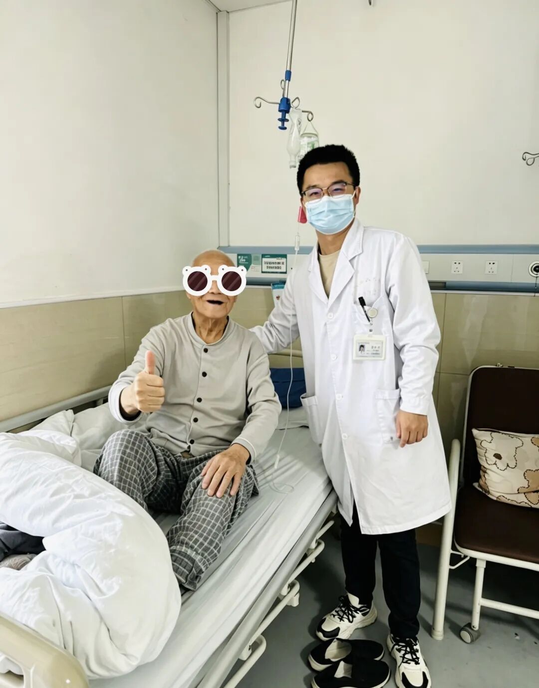 该患者因肝硬化导致食管胃底静脉曲张破裂出血,病情危重。消化内科二病区万焱鑫主任团队制定了周密的个体化治疗方案,并顺利完成了手术。术后第二天,患者已可下床活动,恢复良好。出院之际,老人满怀感激地竖起大拇指,向医护团队表达由衷的谢意。