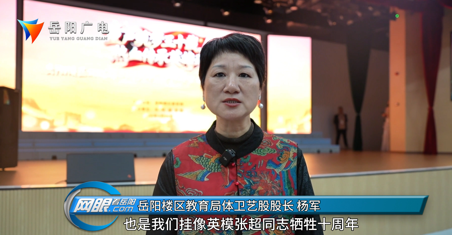 岳阳楼区教育局体卫艺股股长 杨军:恰逢(岳阳楼区)建区三十周年,也是我们挂像英模张超同志牺牲十周年,(活动)旨在检验各中小学校的合唱教学的效果,培养学生的艺术素养,促学生全面健康发展。