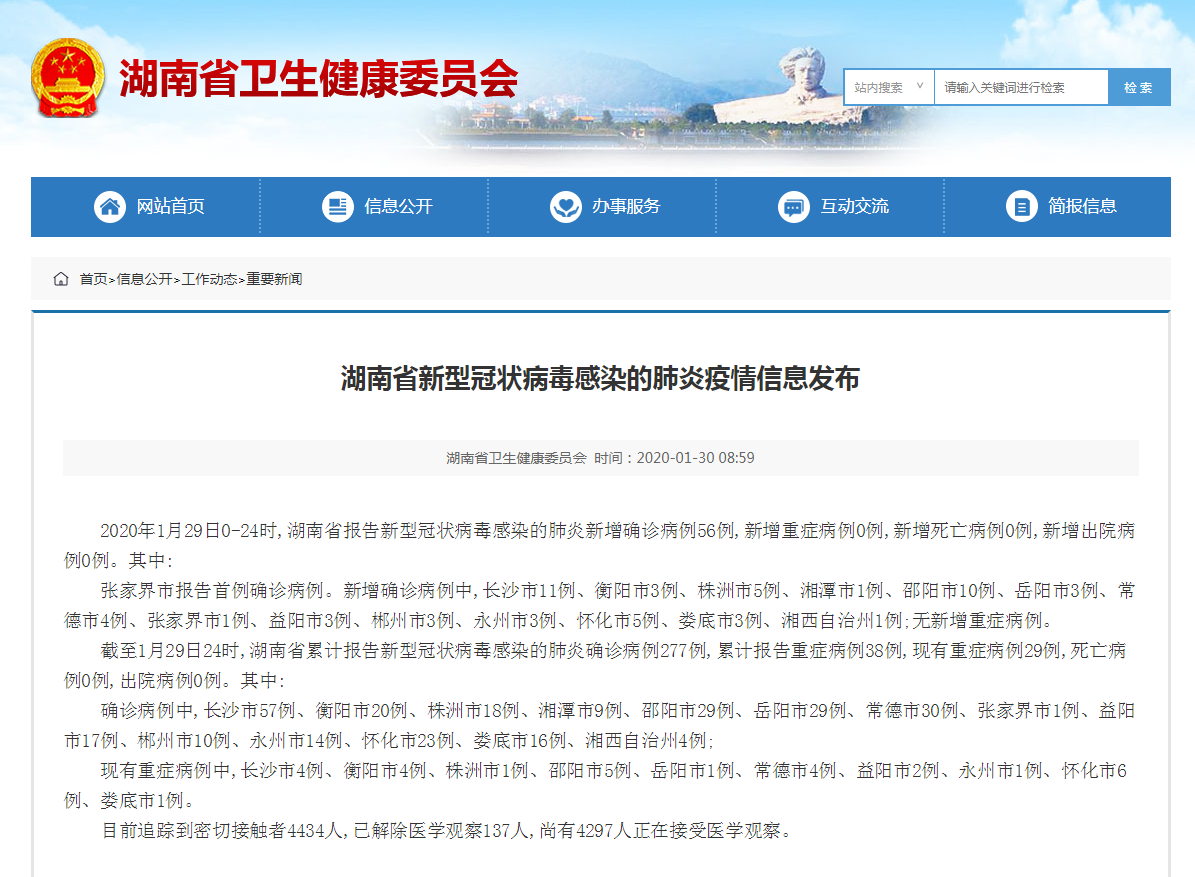 截至1月29日24时,湖南省累计报告新型冠状病毒感染的肺炎确诊病例277例,累计报告重症病例38例,现有重症病例29例,死亡病例0例,出院病例0例。其中: