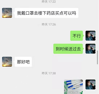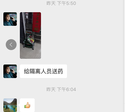 1月29日下午5点22分,因家中小孩有鼻塞、咳嗽的现象,张先生通过微信询问值班的云梦社区支部副书记姚进能否外出买药。姚进收到信息后,第一时间电话询问张先生一家人身体体征、体温数据,28分钟后,姚进及时将药品送至居民门口外并电话告知。