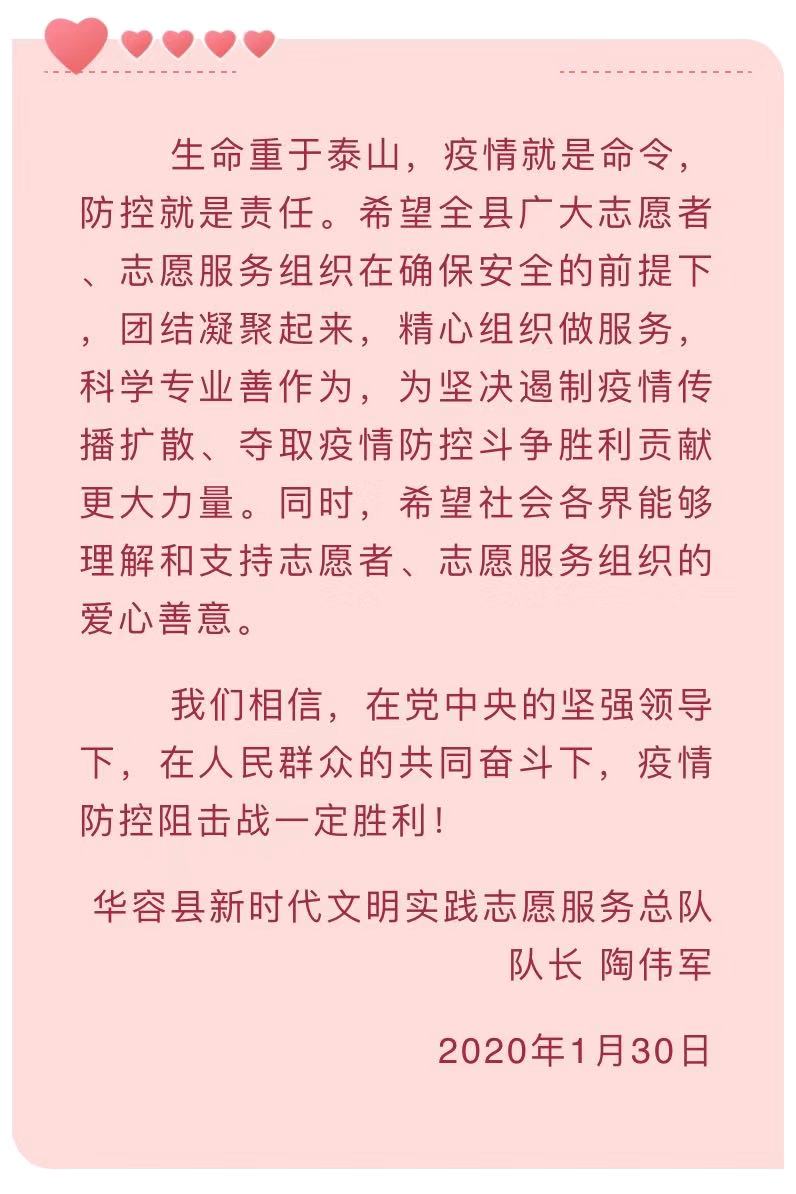 “广大志愿者、志愿服务组织弘扬志愿精神,踊跃投身疫情防控工作,充分彰显了爱心善意和责任担当,成为联防联控、群防群治的重要力量!”1月30日,华容县人民政府县长陶伟军以县新时代文明实践志愿服务总队长身份再次发出公开倡议,号召全县广大志愿者、志愿服务组织积极有序参与疫情防控,做到带头加强防护 、依法有序参与、帮助宣传普及 、助力排查治理、做好医疗保障、提供专业服务,共同打赢疫情防控阻击战。