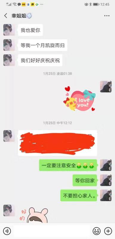 大年初一,汤思奇收到了妻子朱子幸发来的新年信息:“等我一个月凯旋,我们好好庆祝庆祝。”因当晚车流量,汤思奇只在微信上回复一张“我爱你”的微信表情图。