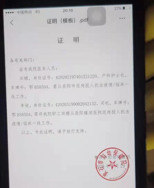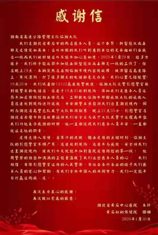 岳阳广电全媒体讯(记者/ 宁平)同饮一江水,湘鄂一家亲。1月30日,湖北黄石市中心医院、妇幼保健院两名医护人员安全返乡后,向湖南省高警局岳阳支队临湘大队发来感谢信,感谢岳阳高警安全护送,让她们及时赶回单位,如愿以偿参加抗击疫情一线的工作。至此岳阳高警近两天已安全护送了6名逆行勇士返鄂工作。