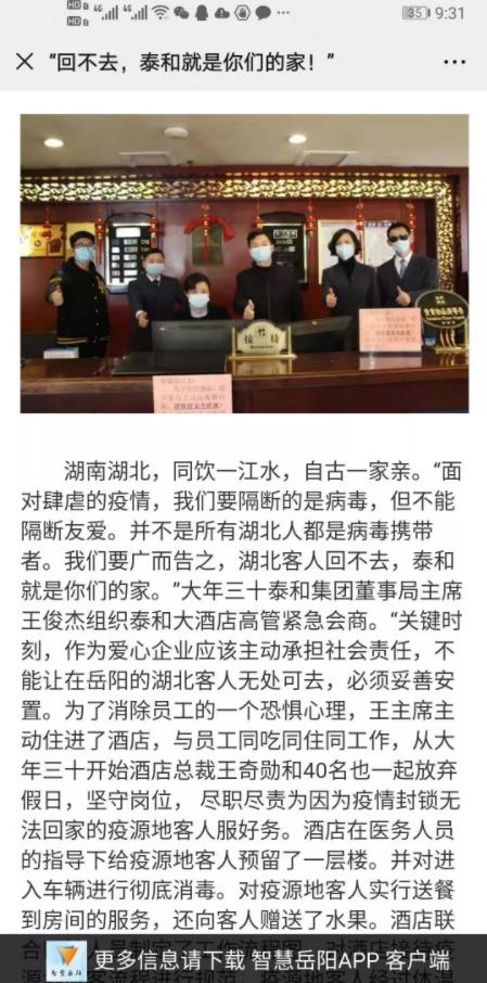 泰和集团泰和大酒店:“湖北客人回不去,泰和就是你的家”,大年三十,泰和董事会主席王俊杰组织泰和大酒店高管紧急会商,决定腾出一层楼,接待疫区不能回家的同胞,为他们营造一个安全、温暖的家。