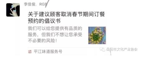 平江红绿蓝公司(平江味道):连续发布“关于建议顾客取消春节期间订餐预约的倡议书”,不顾经济亏损和负面影响,只为做到企业初心——“责任心、有担当”,积极配合政府防控疫情传播,为抗击疫情贡献力量。