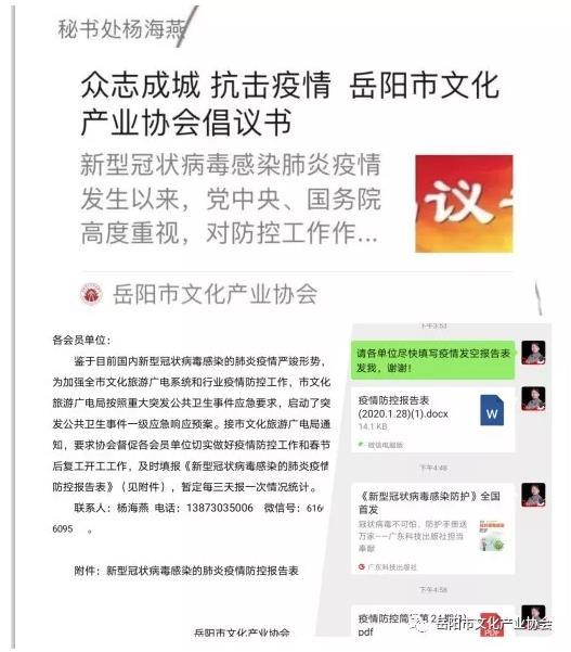 新型冠状病毒肺炎疫情自发生以来,受到社会各界高度关注,牵动着每一个人的心。面对疫情,岳阳市文化产业协会高度关注疫情讯息,传播抗疫正能量,号召会员单位迅速行动起来,发挥自身优势,在这场疫情防控攻坚战中贡献力量。