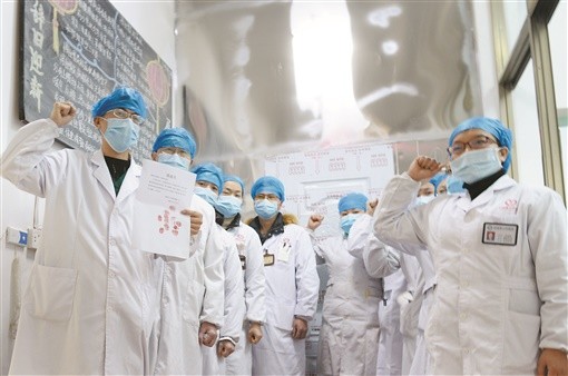 (有我们在,请放心! 2月1日,在医护人员的精心治疗下,永州市两例新型冠状病毒感染的肺炎患者治愈出院,离开永州市中心医院时,医护人员握拳示意加油。此次的疫情并不是无法战胜,做好科学防护,相信党和国家,相信奋战的白衣战士,一定能打赢这场硬仗! 徐衍 摄)