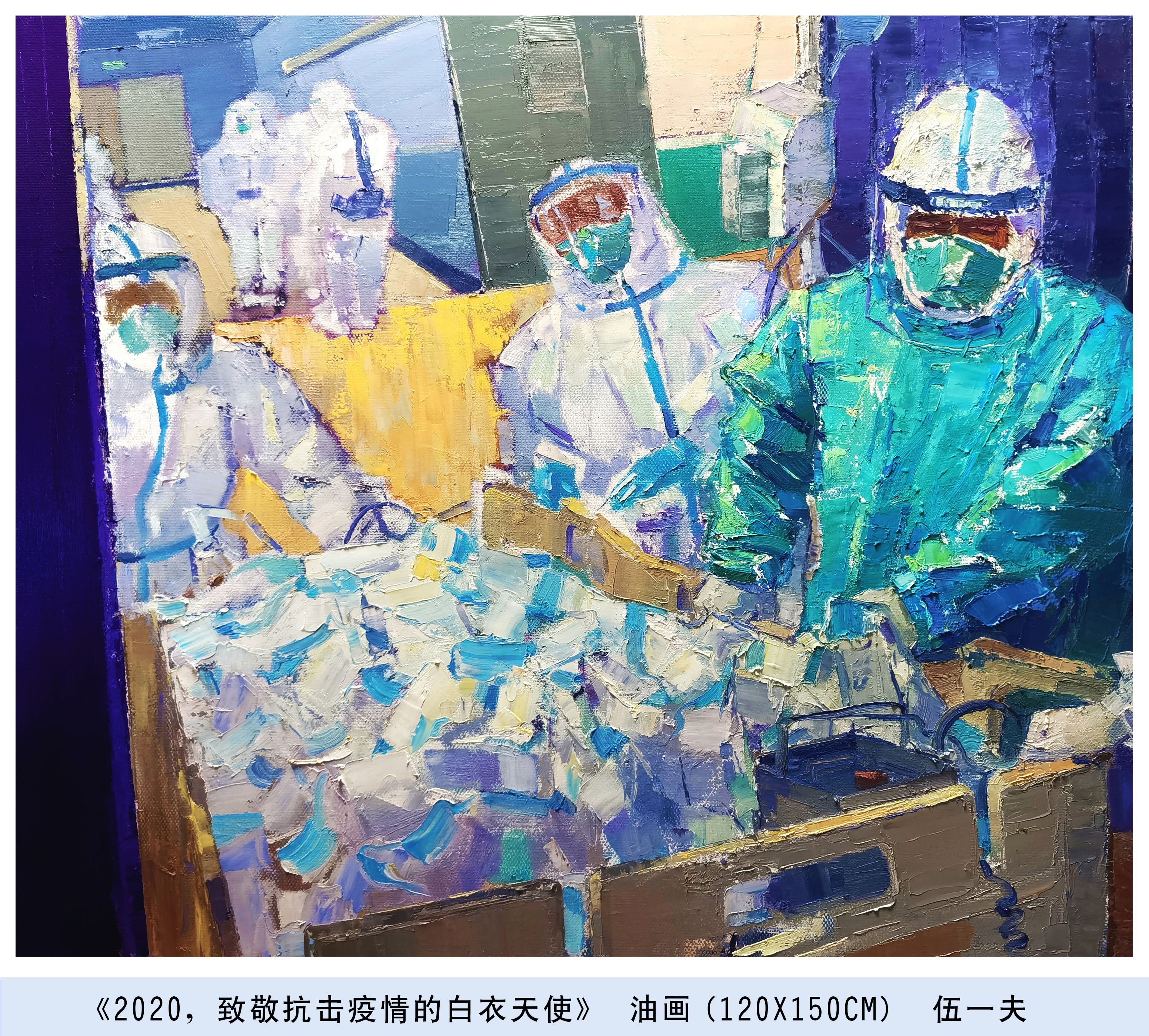这是一个离群索居的春节,这是一串足不出户的日夜,画友们通过微信朋友圈,看到这幅(120×150cm)的油画作品:《2020,致敬抗击疫情的白衣天使》,仿佛看见了“最美逆行者”白衣战士们:湘雅女将艾宇航,重症监护室的李兰娟,跛腿院长张定宇,天使的天职就是救死扶伤,白色防护服就是最美的战袍。