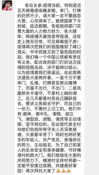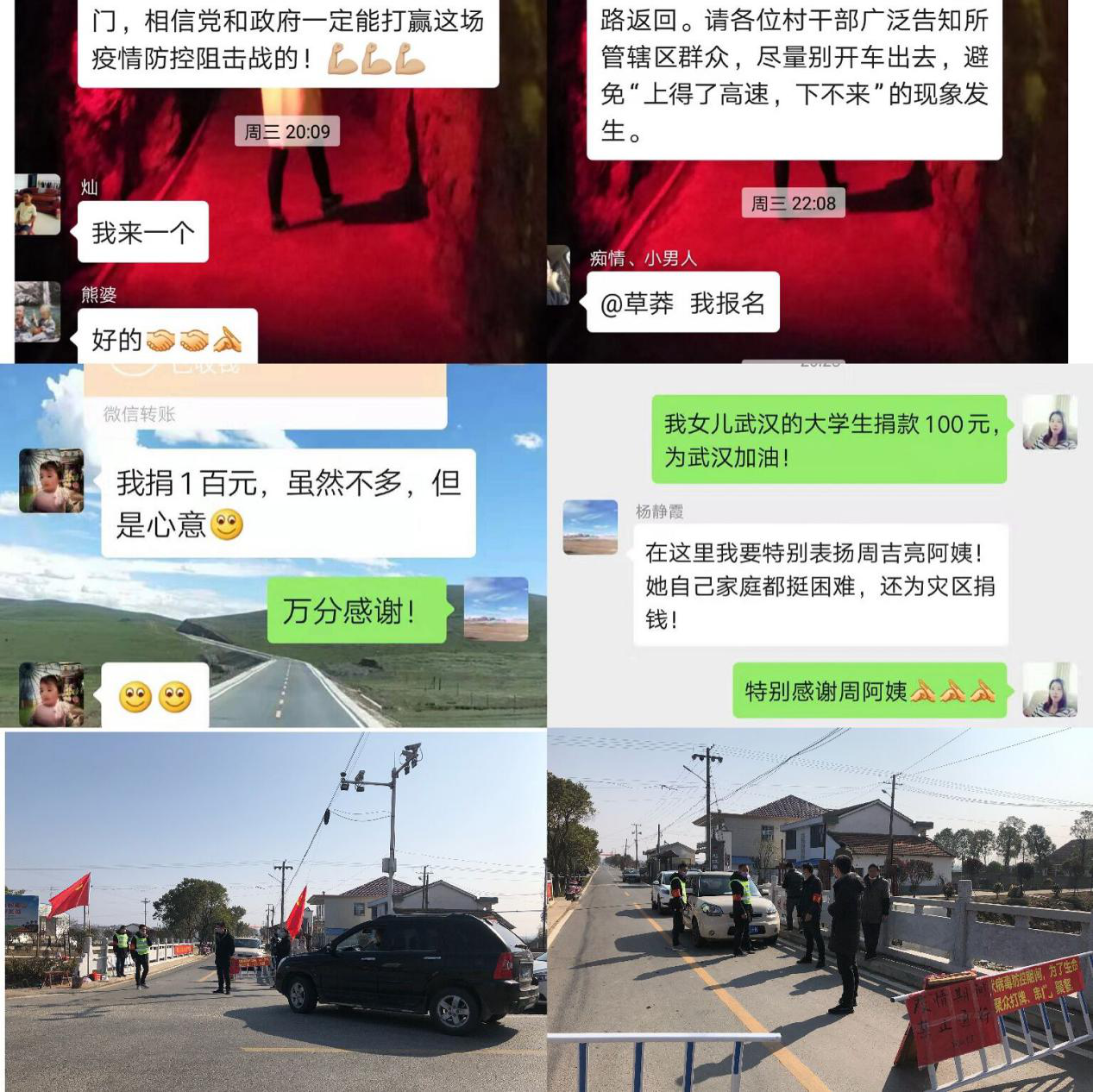 岳阳广电新媒体中心讯(通讯员 凤凰乡 宋玉)“我报名”“我来一个”“向横港村踊跃报名义务巡逻和守卡的志愿者们道一声谢谢,你们辛苦了!”“不出行,不串门,不扎堆,不聚众打牌,同心协力打赢这场疫情阻击战”“给志愿者点赞,感恩你们”。 2月1日晚上,屈原管理区凤凰乡横港村的各个微信群热闹非凡,点赞打卡的信息在群里爆屏。原来,横港村为了做好疫情防控工作,在村党总支号召下,由党员骨干联合发出的齐心协力共抗疫情的倡议书得到了全村党员群众的积极响应,有微信报名参与义务值守的,也有电话直接打到村干部那里强烈要求的,横港村齐心抗疫的热情被全面点燃。