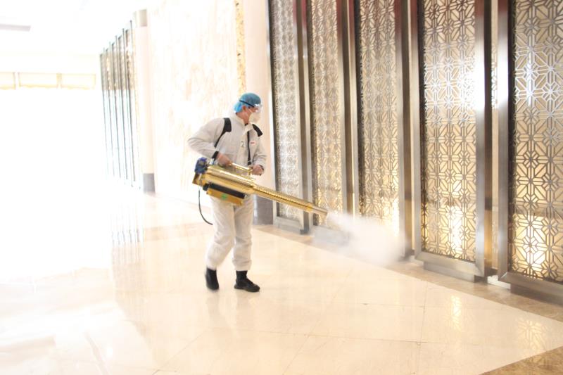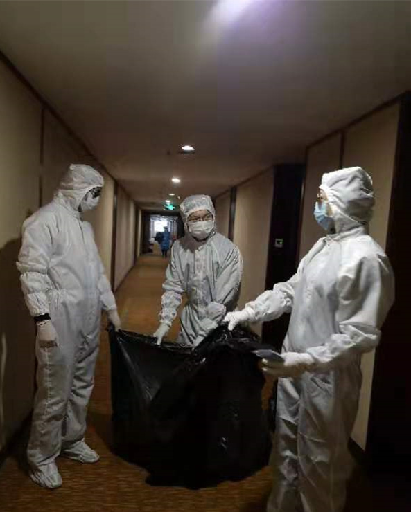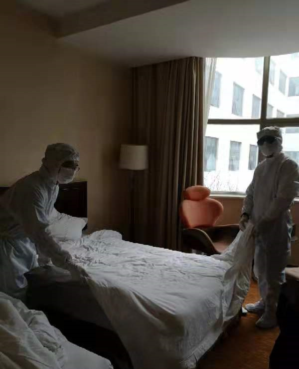 “我来了!”王奇勋穿好隔离服,走进了客房,清垃圾,换床单,消毒,像一名熟练的客房服务员。