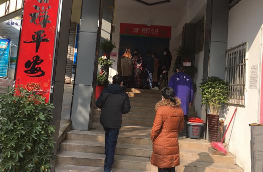 鹰山社区在超市前展开叫号购物模式