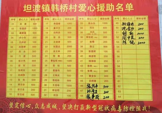 岳阳广电全媒体讯(通讯员 王力 黄茜)“#接龙 公益抗冠状,爱心齐参与!爱心援助名单······”近日,受新型冠状病毒感染的肺炎疫情影响,昔日里热闹的坦渡镇街道上显得分外冷清,而各村党员交流微信群中却信息不断,村民们踊跃捐钱赠物,爱心援助名单越来越长。