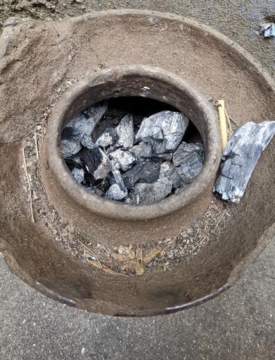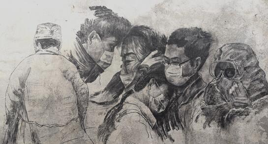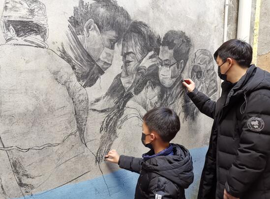 他看中了老家房子唯一可以画画的外墙,手中没有任何绘画工具,他就在烧火柴房找来了木炭作画。他带着儿子在粗糙的墙面画了两天,终于,将题为《义无反顾》木炭壁画大功告成。该画生动地表达白衣天使们请愿抗击冠疫出征时的感人瞬间。