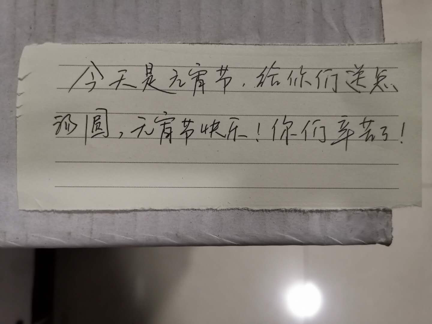 回到值班室内,民警打开纸箱发现里面是一盒盒汤圆,“今天是元宵节,给你们送点汤圆,元宵节快乐!你们辛苦了!”纸箱中一张字条上这样写着。
