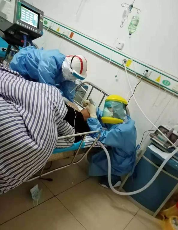 上午九点多,由平江转入了一位多器官功能不全的患者,本来上晚班的我被紧急叫过来支援。患者需要立即气管插管!我身穿隔离衣、防护服,佩戴双层手套、护目镜、面罩,身体实在有点笨重。面罩上迅速腾起的雾气,加上患者躁动不安不配合,平常得心应手的专业操作此刻变得困难了很多。患者不停的朝我呛咳,痰液全喷在我的面罩上。顾不上了!救人第一!我又继续尝试,气管插管终于进去了。护士立马过来帮忙固定导管,连接管道,调整呼吸机参数,病人血氧饱和度上来了!