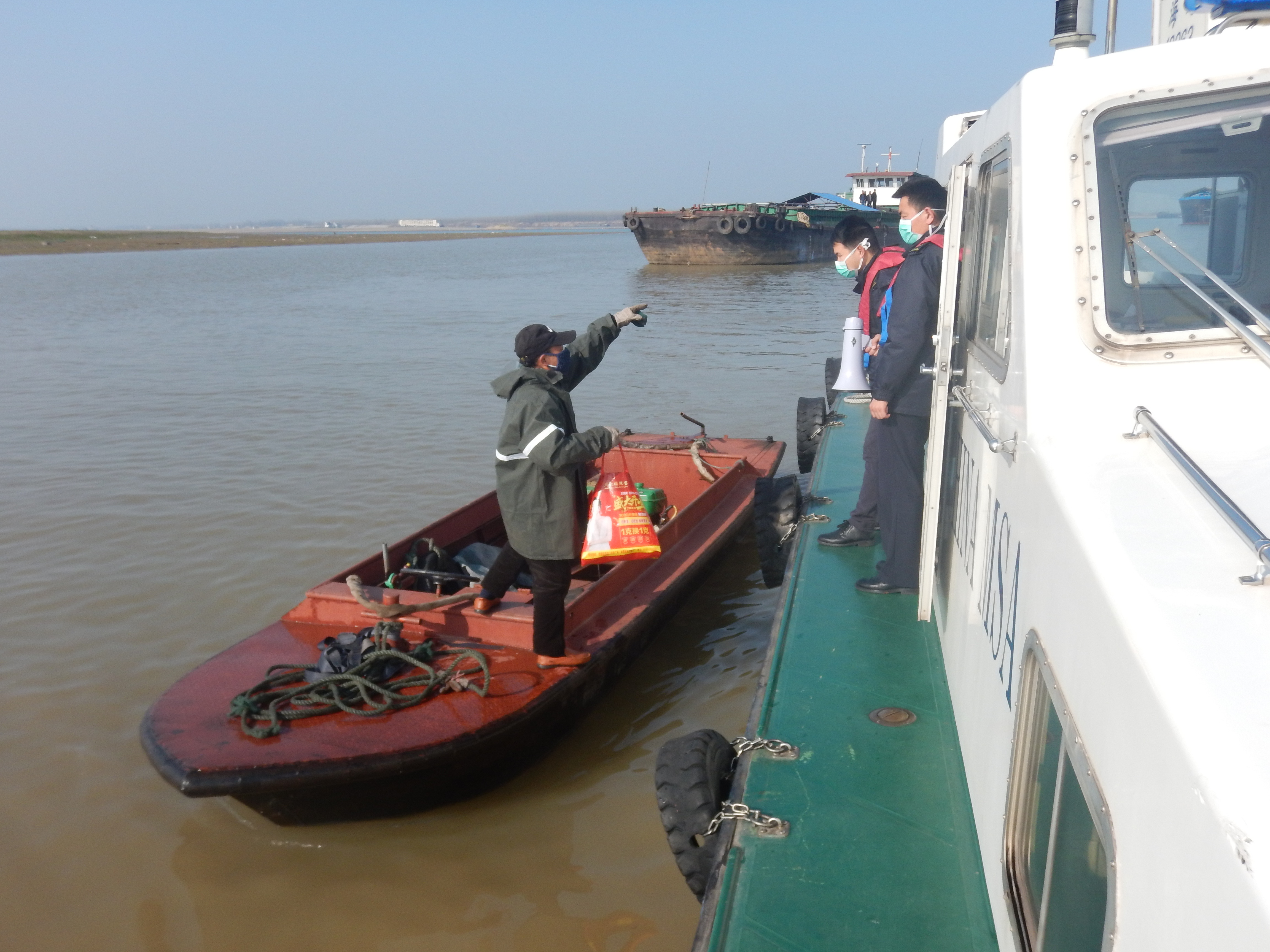 2月9日17:40,岳阳海事局城陵矶海事处值班人员接到紧急通知,蒙华铁路大桥水域附近有船员私自放下船舶救生艇往岸边开,即将上岸。疫情就是命令,险情就是责任,接到指令后,城陵矶海事处党员突击队立即乘“海巡12263”前往目标水域,拦截私渡船员,并为其测量体温,告知疫情严重性,教育船员私自上岸容易感染,也是对其他船员的不负责任。经过劝解,该船员意识到问题严重性,掉头返回船上。
