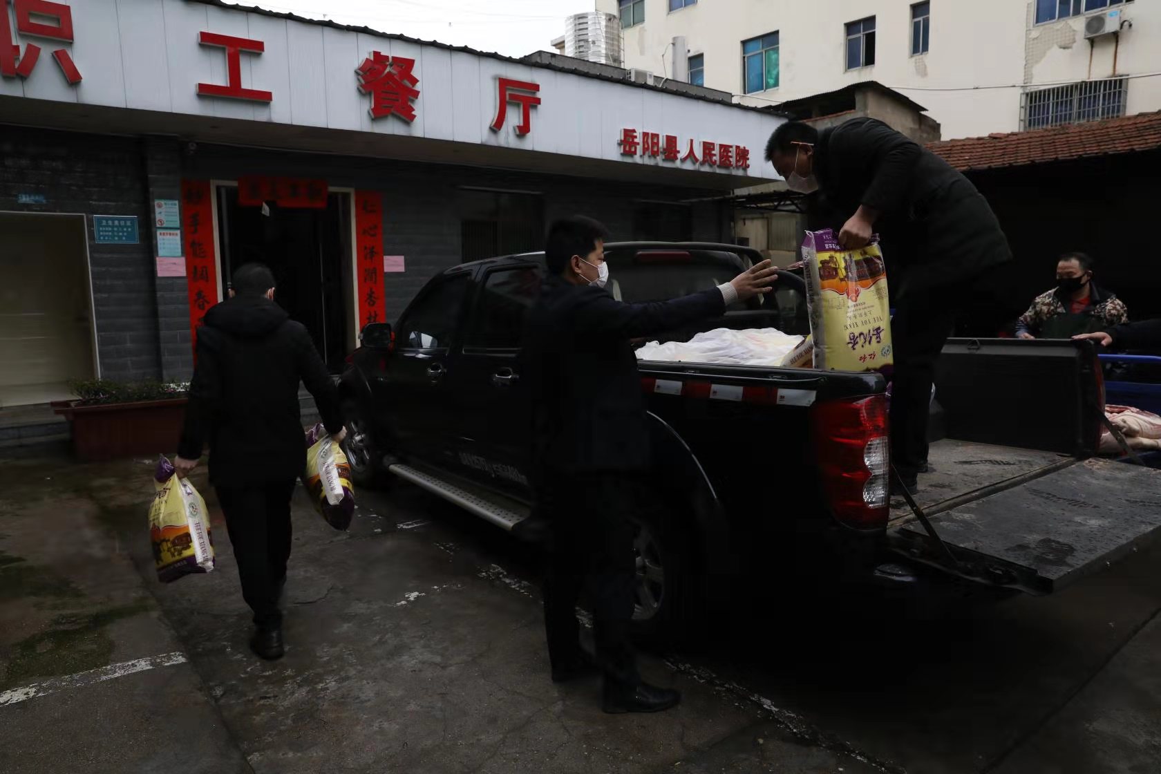 岳阳广电全媒体讯(通讯员姚军良)2月10日上午,岳阳县城荣家湾细雨绵绵。一台满载着大米的皮卡车和一辆拉着土猪肉的三轮车驶进该县人民医院食堂,8个戴着口罩的帅哥美女匆匆卸下物资,没喝一口茶,就消失在归途中。