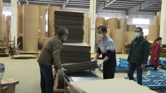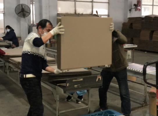 △金诺包装厂房里工人正在制作医疗物资包装箱