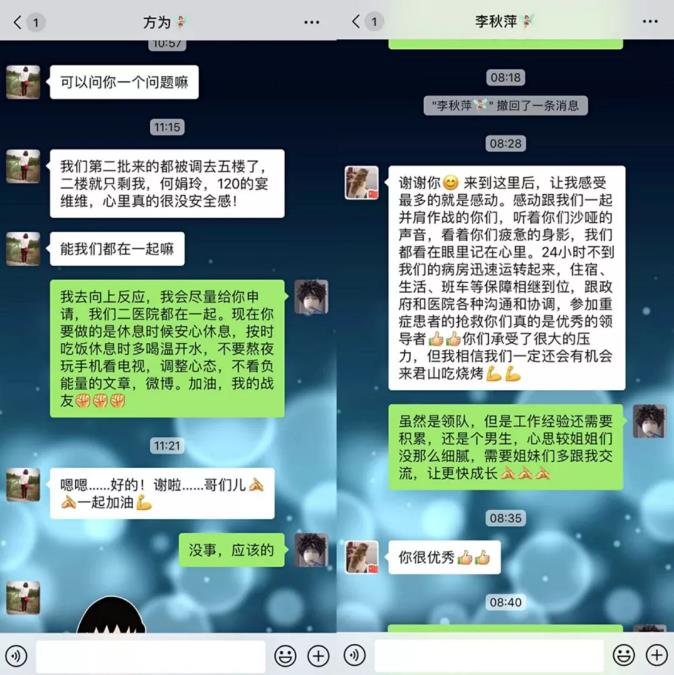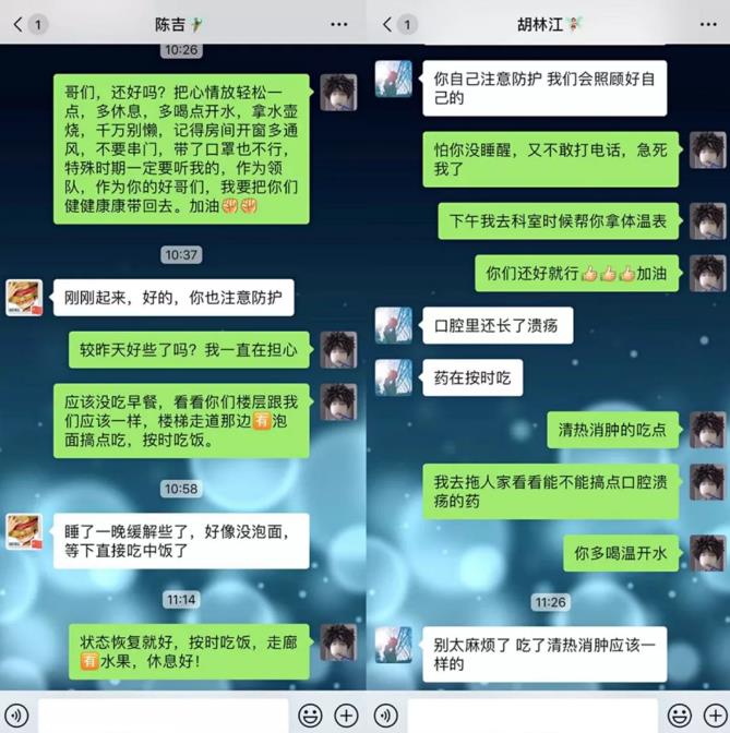 作为护士长,看到日日夜夜与疫情短兵相接的各位同事,周莎虽是男生,却另有一般侠骨柔情。得知同事不舒服了,他总是第一个忙前忙后照顾的;每有同事进隔离病房,他都在一旁严格把关;大家睡得好吗?吃得好吗?喝水了没?都是他的心头大事。周莎不仅危难情况冲在前面,还默默地承包了重症患者的护理文书、三测单的整理等大量工作:“我多做一点,她们就能休息得好一点。”