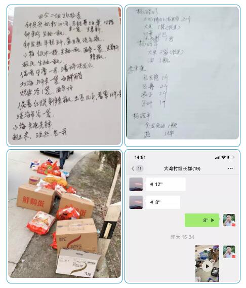 “油1桶、盐5包、大蒜1斤、奶粉2灌……”在大湾村组长群里,各组组长每日微信群内线上报送“代购清单”,“90后”村干部袁忠伟则每天根据“点单”来“跑腿”代购,再分发到各组村民手中,为了让大家放心,袁忠伟还实时拍摄小视频直播“代购”过程,让大家吃得放心,买得安心。