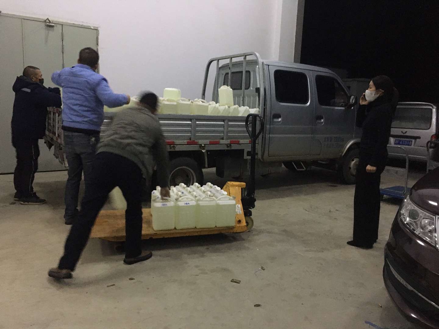 兄妹二人在工人的帮助下 将400瓶消毒水全部装车
