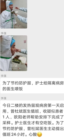 何文峰说:那些在一线的医护人员社区工作者,(医生)饭是喂着吃的 上厕所也是夹个尿不湿,他们都是这么的付出 很受人感动,我身体不行 就只能到处托人打听,看到哪里可以联系上口罩,还有防疫的物资,最后一个同学他推荐的(消毒液厂)。