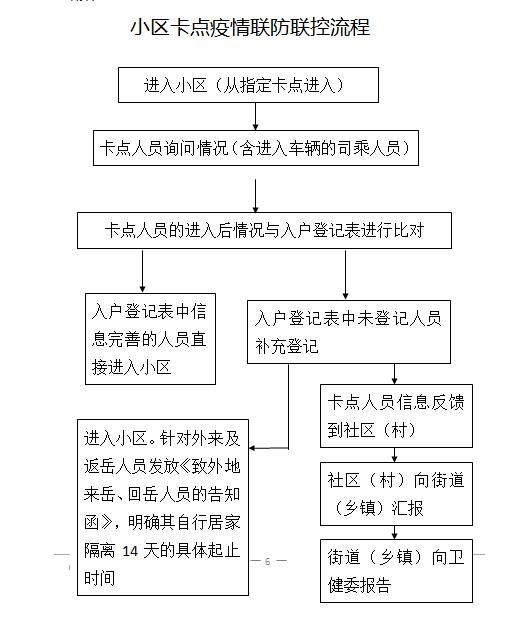 四、规范工作流程。严格落实“找得到、管得到、不漏一户、不落一人”的工作要求,按照小区门岗卡口疫情群防群控要求,做好防控工作。工作流程见附件。