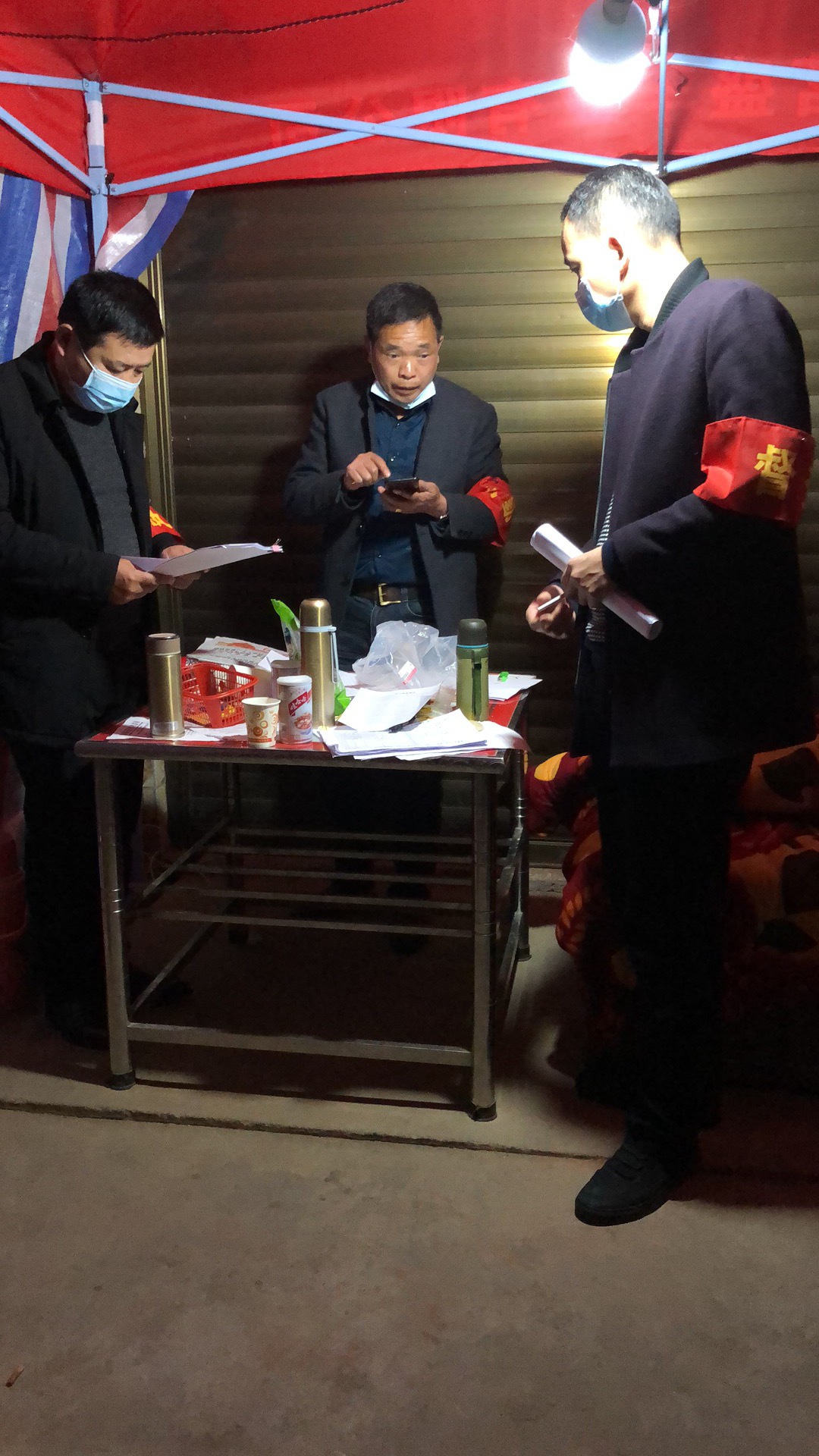 党员张建宏,戴智慧等,执勤过程中,他们困了就揉一揉手,冷了就跳一跳脚,没有一丝怨言,村民纷纷为他们的无私奉献精神点赞。