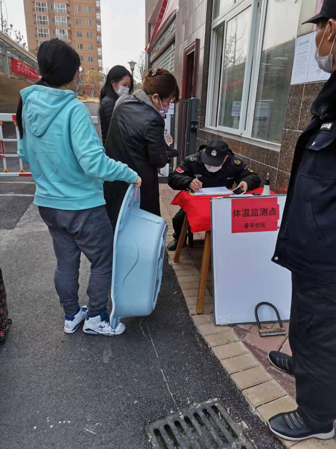 社区结合小区居住面积小,人员高度密集的特点,在小区主要入口处设立“党员示范岗”,对外来车辆及人员进行体温检测,并做好登记。近期,为了减少交叉感染,春华社区启动免接触社区健康监测管理系统的线上监测平台,自制“全民健康监测表”微信小程序,及时搜集居民的信息,引导居民每天足不出户就可以上报自己的健康信息,让防疫工作事半功倍。