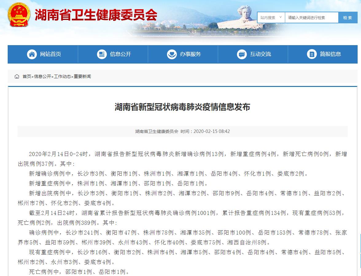 2020年2月14日0-24时,湖南省报告新型冠状病毒肺炎新增确诊病例13例,新增重症病例4例,新增死亡病例0例,新增出院病例37例。其中: