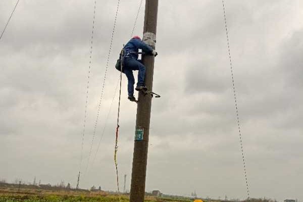 因为下雨的关系,电杆非常湿滑,他们每爬一步都要比平时困难得多。登杆后,抢修队员对故障导线进行拆除,每个步骤看似有条不紊,其实却难度很大。
