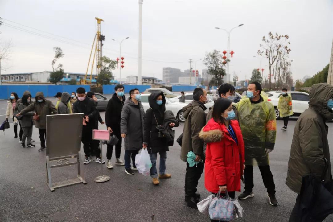 6906工厂复工人员排队消毒、检测、登记后入厂