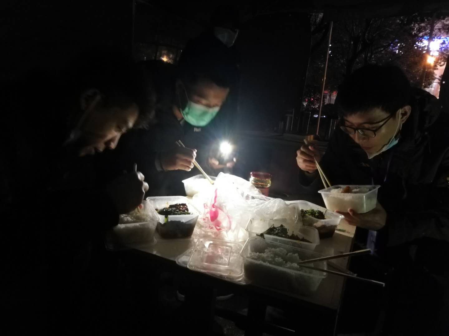 (一线值班的工作人员在抽空吃工作餐)
