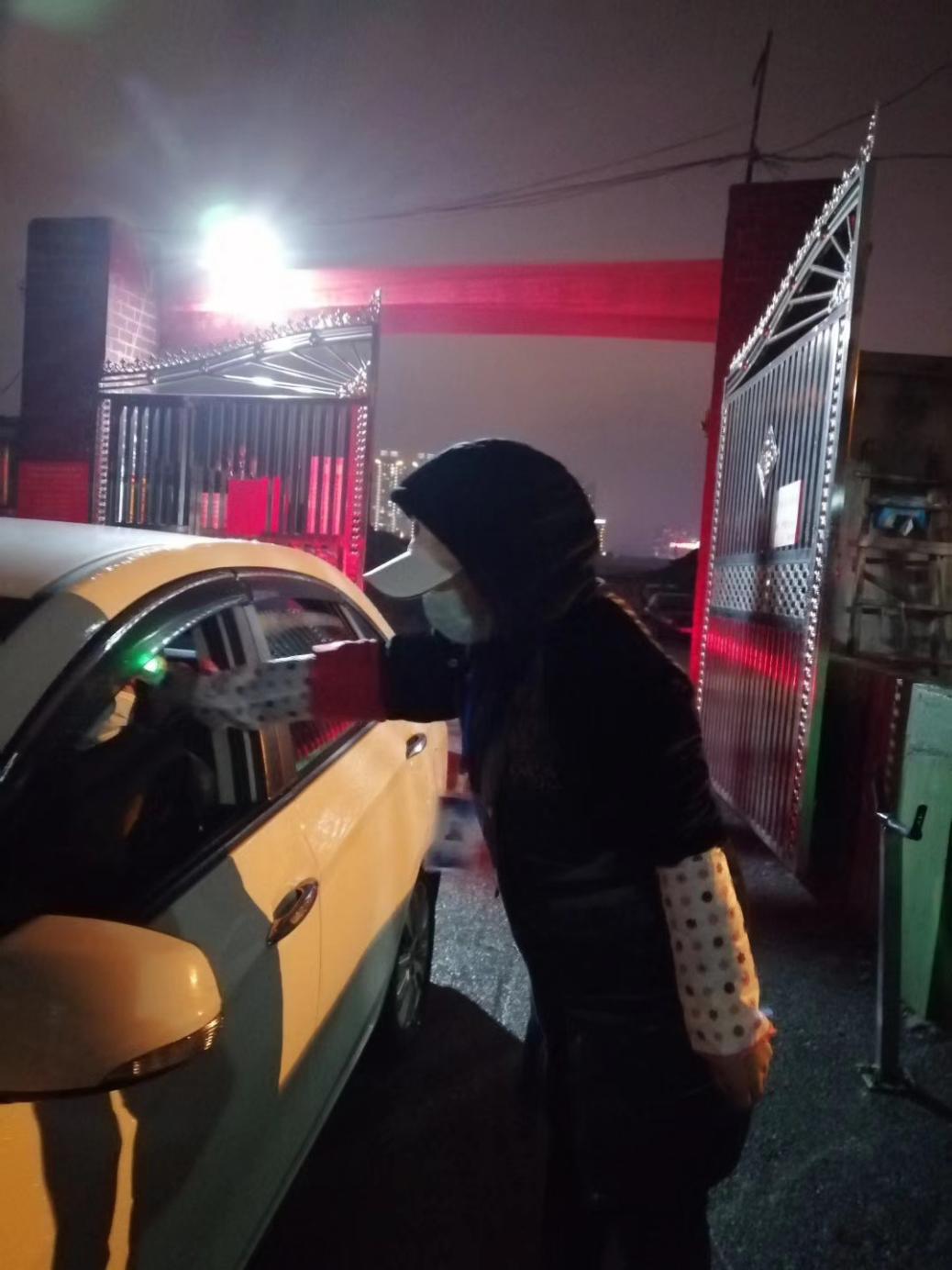 (海棠社区许亮在寒风中为过路人员测量体温)