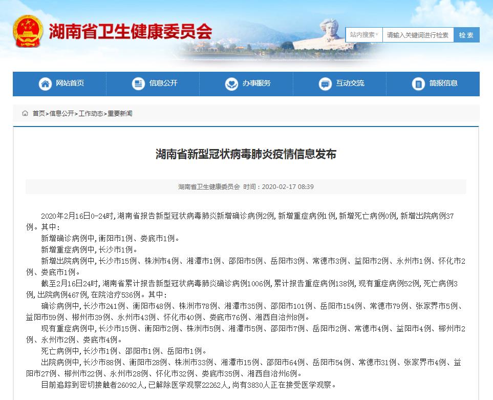 2020年2月16日0-24时,湖南省报告新型冠状病毒肺炎新增确诊病例2例,新增重症病例1例,新增死亡病例0例,新增出院病例37例。其中: