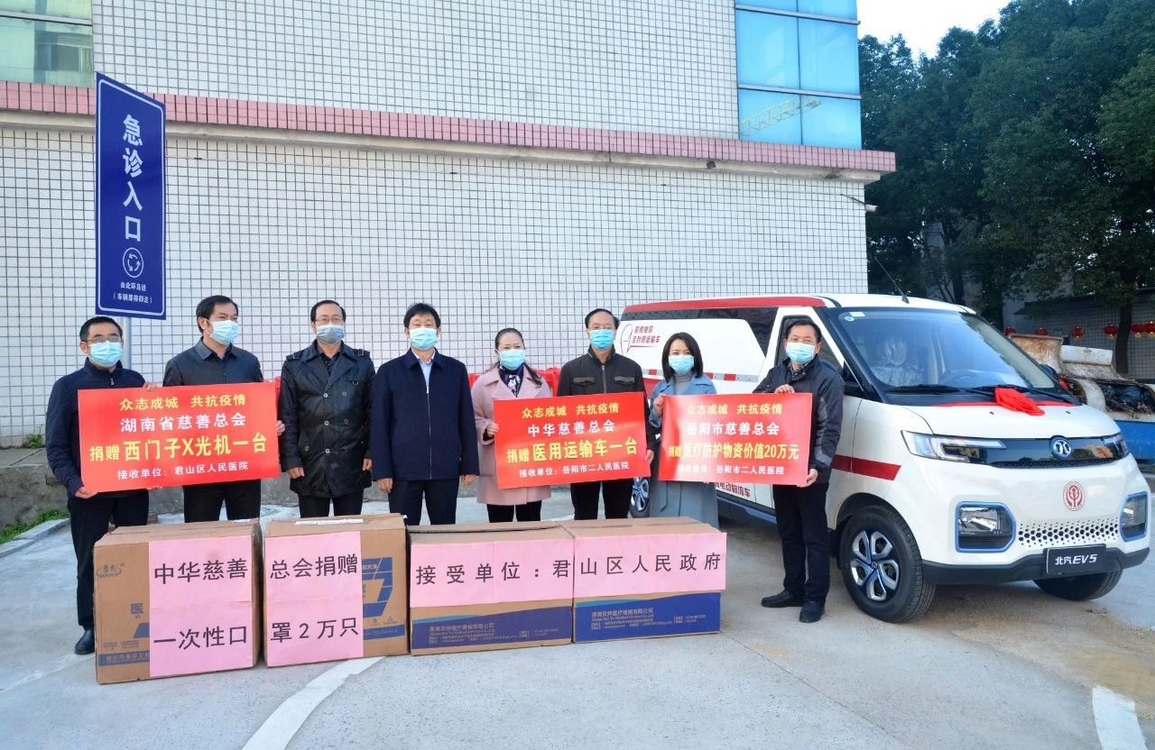 此次捐赠物有由岳阳市慈善总会捐赠的疫情防控资金20万元,由湖南省慈善总会捐赠的1台移动的X光机,由中华慈善总会捐赠的2万个医用口罩和1辆医用运输车,总价值约95万余元。