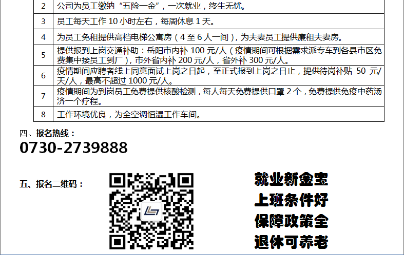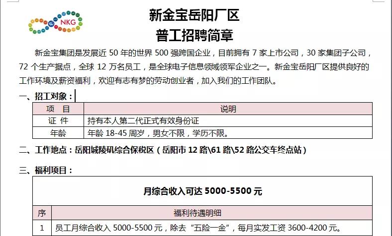 同步推出了《世界500强新金宝集团岳阳工厂招工八条》,据介绍,该招工条件为岳阳“史上”最优惠的招工政策。