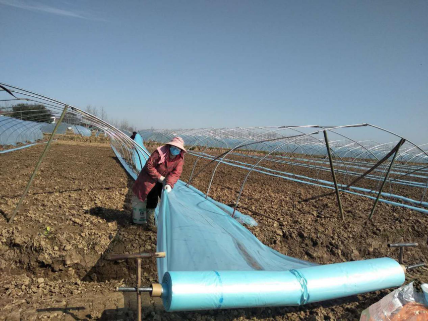 2月18日,青港村种植户方金莲正在西瓜地为搭好的大棚铺设塑料