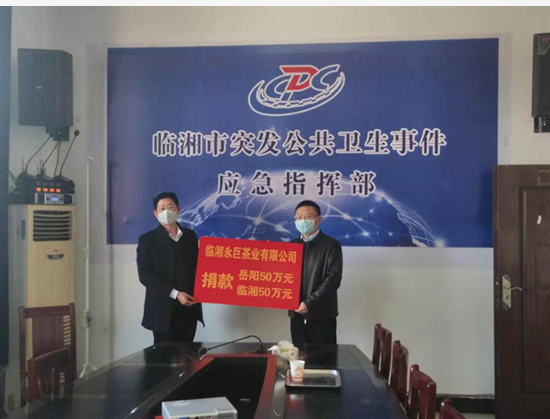 临湘永巨茶业董事长谢东海与总经理潘建勋表示,疫情来袭,为抢救人民群众的生命,阻止疫情传播,医护人员在前方夜以继日地与病菌奋力“厮杀”。作为茶行业代表临湘永巨茶业也应担起责任。.此次捐赠100万元爱心款,希望能够支援岳阳、临湘市医疗机构用于救治物资的采买,为奋战在一线的疫情防控工作尽一份力。