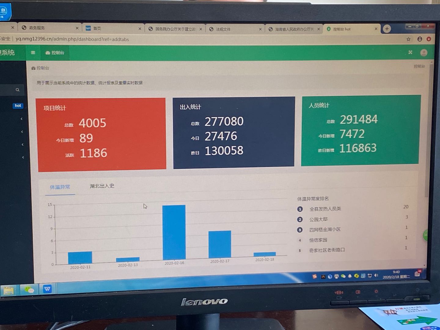 据悉,截止到上午10:00,整个岳阳地区已实施“免接触社区健康监测管理系统”的社区、单位、小区、乡镇卡口已有4005个。其中,岳阳楼区范围内实施二维码操作的小区966个,机关事业单位89个,大小社区全覆盖。已录入291484人的基本信息,每日出入人员统计高达130058次。