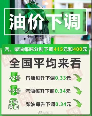 央视财经记者从国家发改委获悉,本次油价调整具体情况如下:汽油每吨下调415元,柴油每吨下调400元。