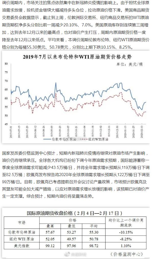 据国家发改委价格监测中心监测,本轮成品油调价周期内(2月4日—2月17日),国际油价继续大幅下降,平均来看,伦敦布伦特、纽约WTI油价比上轮调价周期下降9.20%。受此影响,国内汽油、柴油零售价格下调。