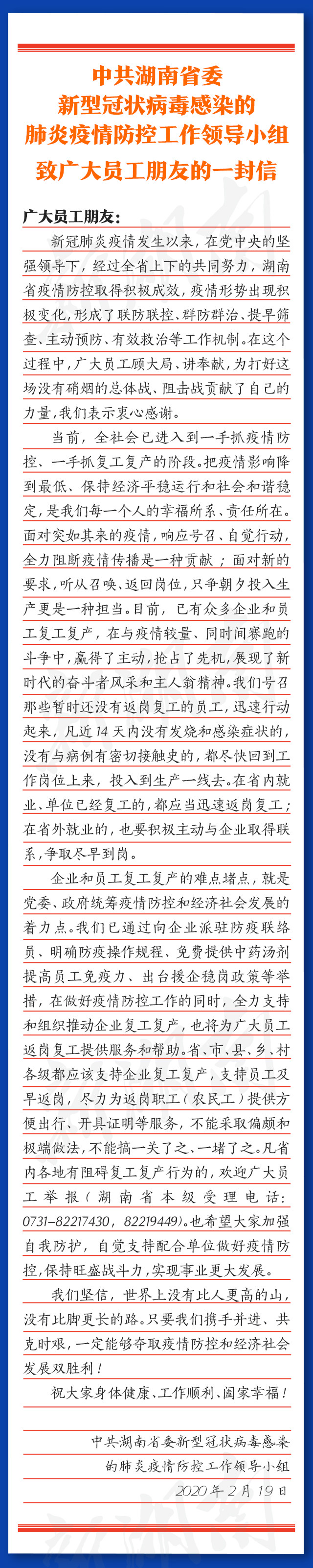省委疫情防控工作领导小组致广大员工朋友的一封信