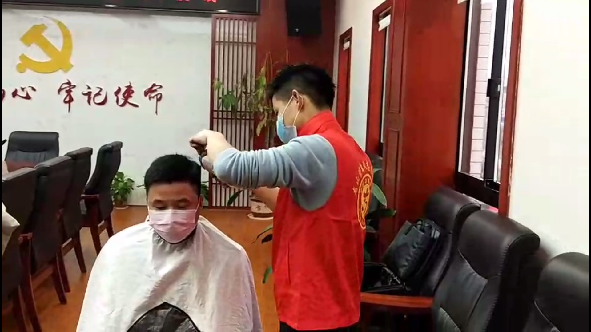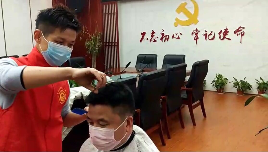 南湖新区龙山管理处机关农业站 赵朗朝:“因为疫情的原因,街上大大小小的理发店都停业了,我这个头发有一个多月没剪过了,省里启动了一级响应,我们从大年初一起就守龙山的卡子上,整个春节没停过,剪完整个人精神多了。”