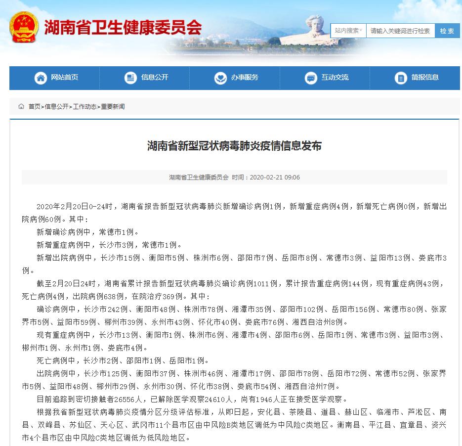2020年2月20日0-24时,湖南省报告新型冠状病毒肺炎新增确诊病例1例,新增重症病例4例,新增死亡病例0例,新增出院病例60例。其中: