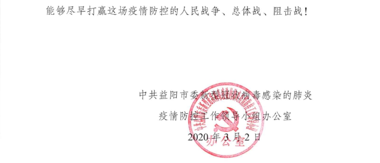 中共益阳市委新型冠状病毒感染的肺炎疫情防控工作领导小组办公室